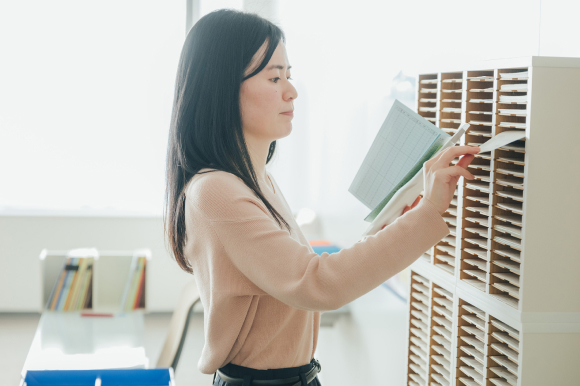事前に、⽣徒の教材準備や前回の学習や宿題の様⼦を確認し、学習当⽇の教材とお渡しする宿題の教材を準備します。
